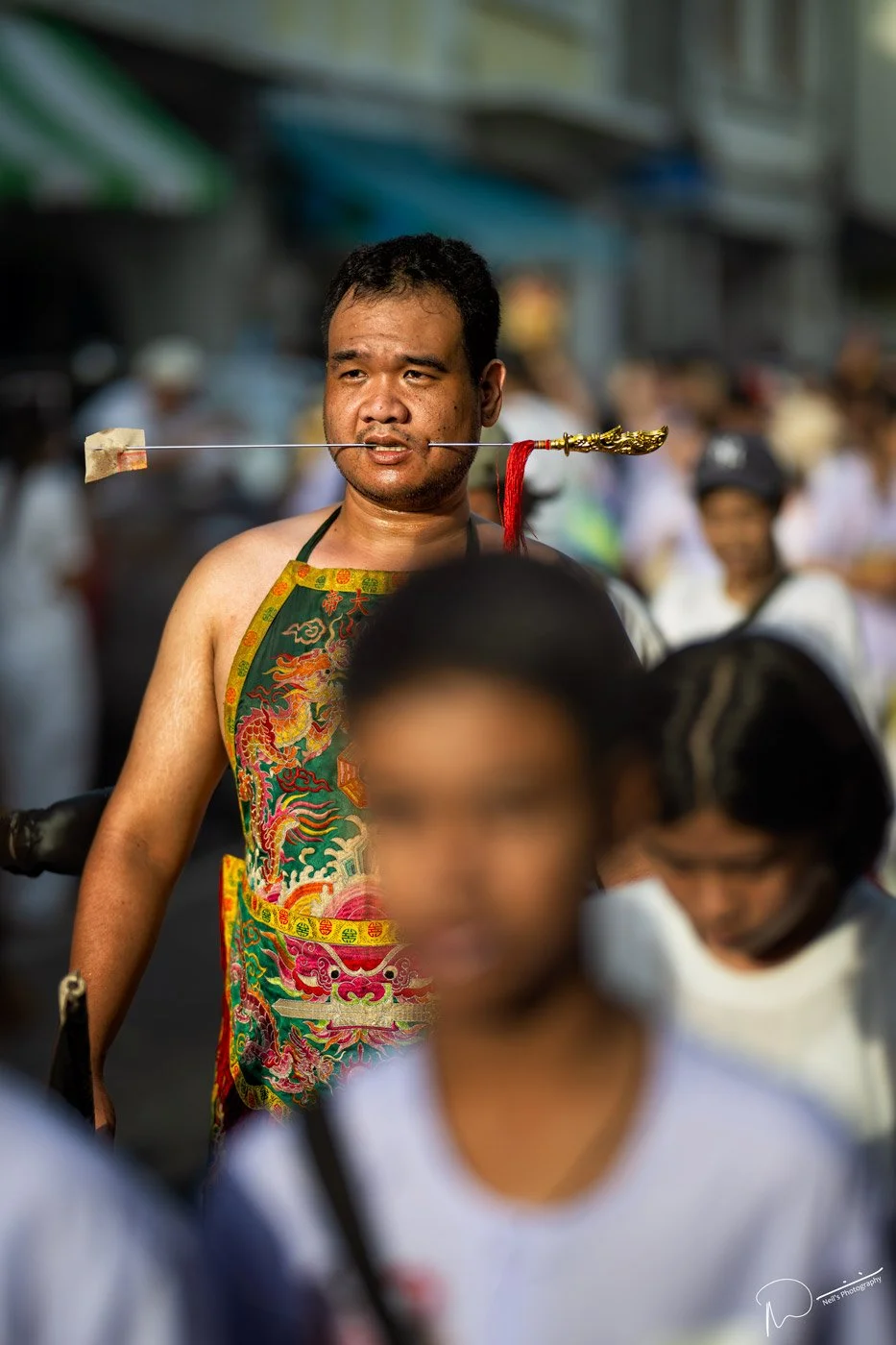 One of the most talked-about aspects of the festival is the Ma Song—spirit mediums who enter trance states and pierce their bodies with knives, skewers, spikes, swords, and other objects.